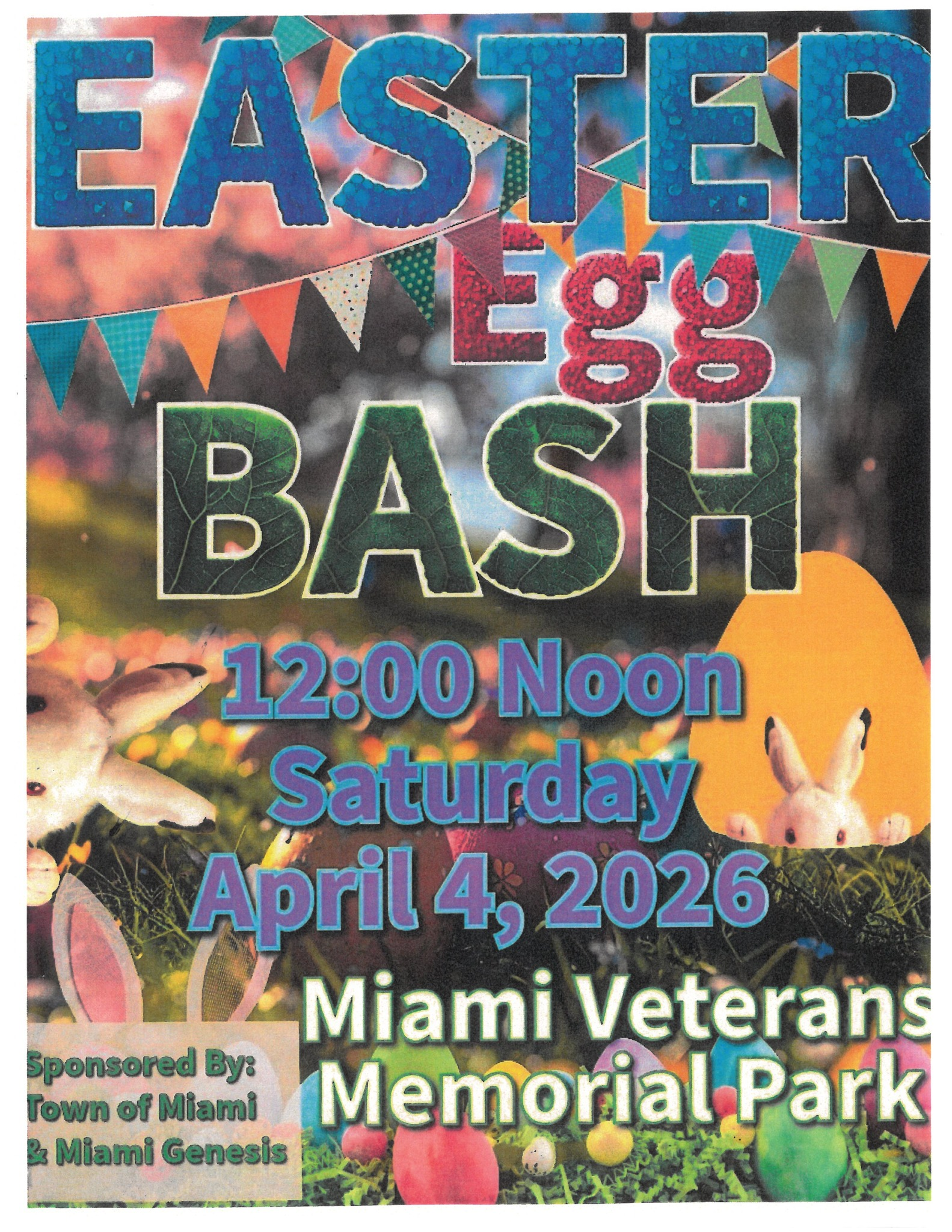 Family Fun -- bring your kiddos to Veterans Memorial Park in Miami on the Saturday of Easter weekend -- April 4 -- at Noon for a FREE easter egg bash co-sponsored by the Town of Miami and Miami Genesis